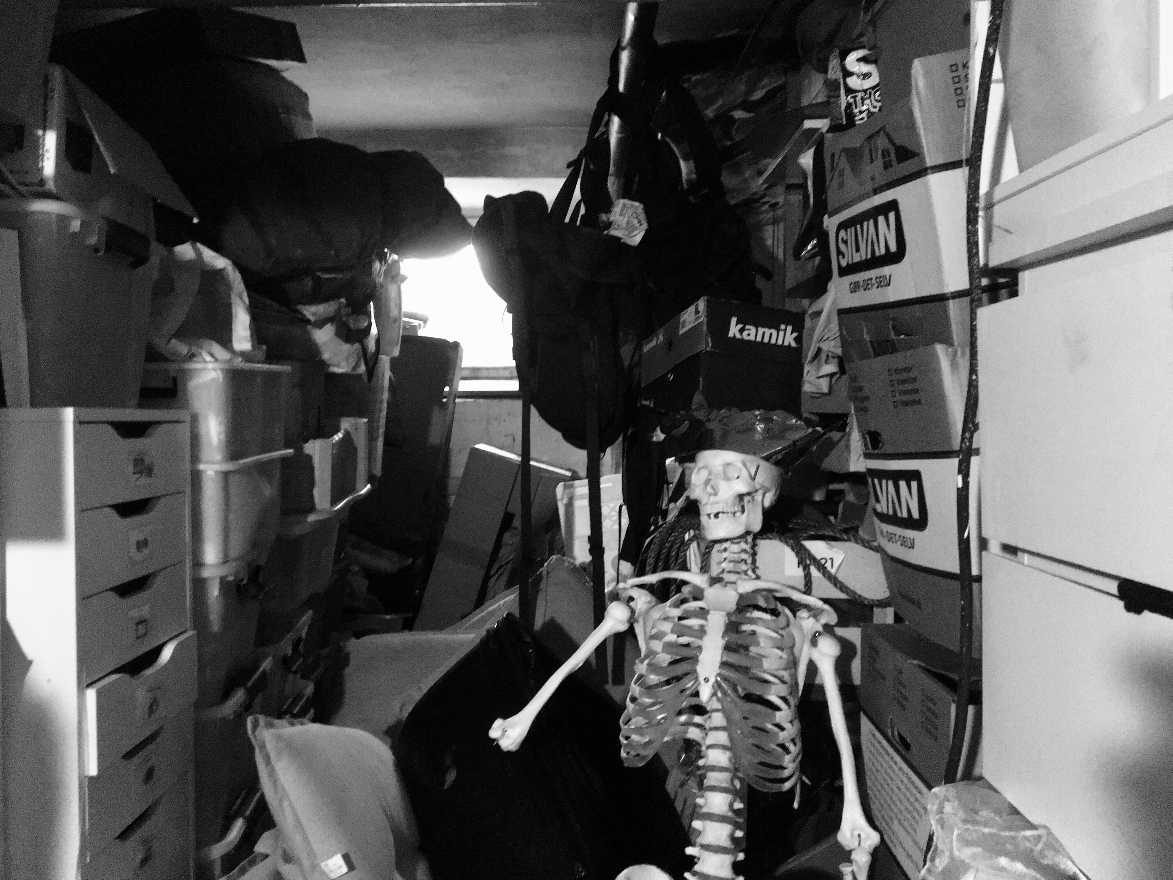 Halvt åbne flyttekasser med assorterede falmende barndomsminder. Sække i gennemsigtig men alligevel uklar plastik med små og mellemstore traumer og i midten af det hele, en vakkelvorn piedestal med en laboratorie-petriskål på toppen påklistret en dymo-strimmel med påskriften: