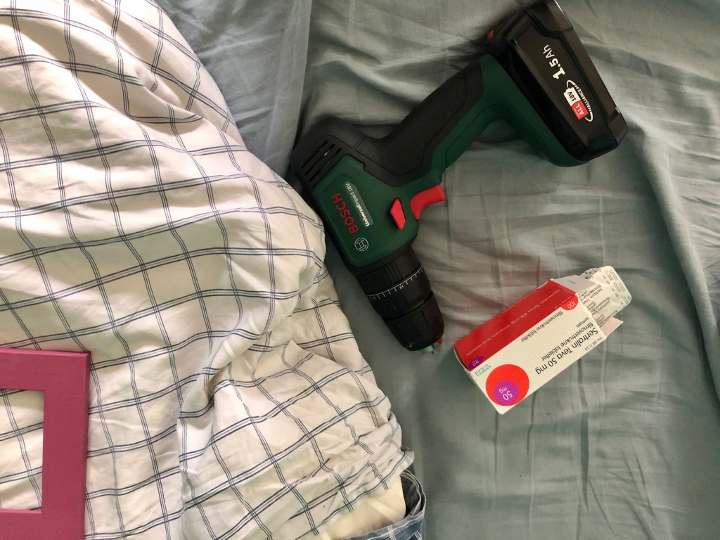 På sengen lå den – hendes batteridrevne Bosch slagboremaskine.