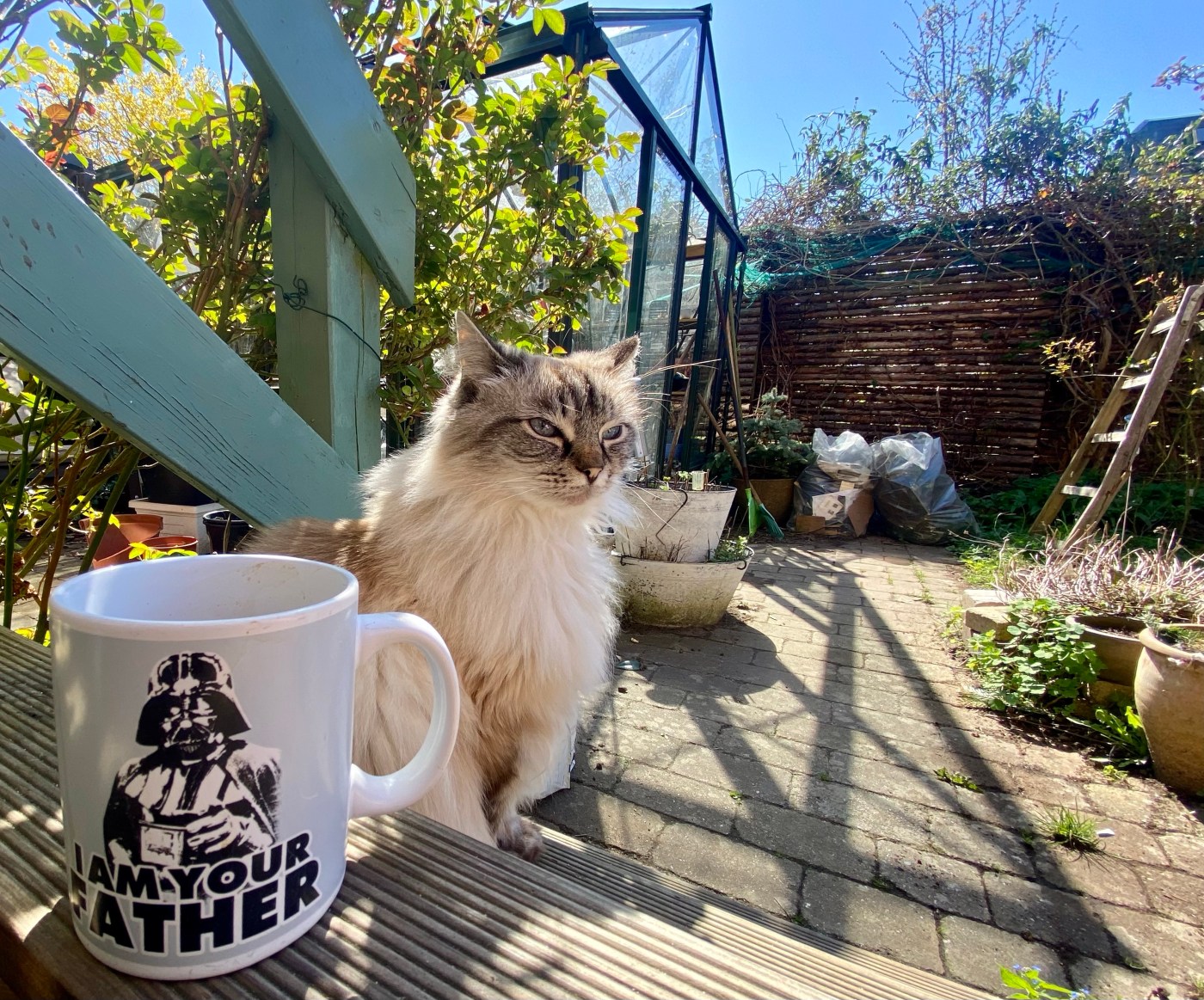 Det er egentlig fint nok, for han kan ikke tåle så meget af den gode mad. Desuden levner hun altid lidt til ham, som han taknemmeligt slubrer i sig, når hans midlertidige forvirring over pludselig at være ene kat i haven, ellers har fortaget sig.