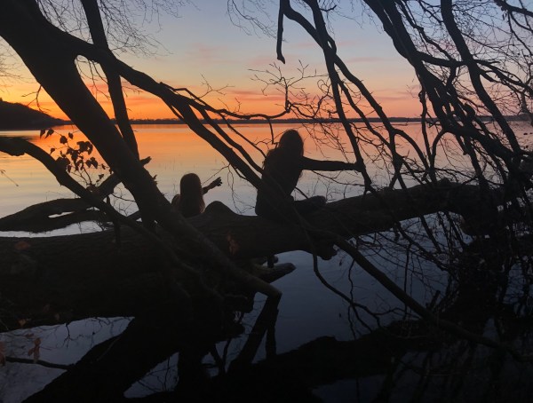 Fotoet er taget klokken 20:55. De to sidder sammen og nyder aftenlyset og stilheden på et væltet træ, der er vedblevet med at vokse vandret ud over Furesøs overflade.